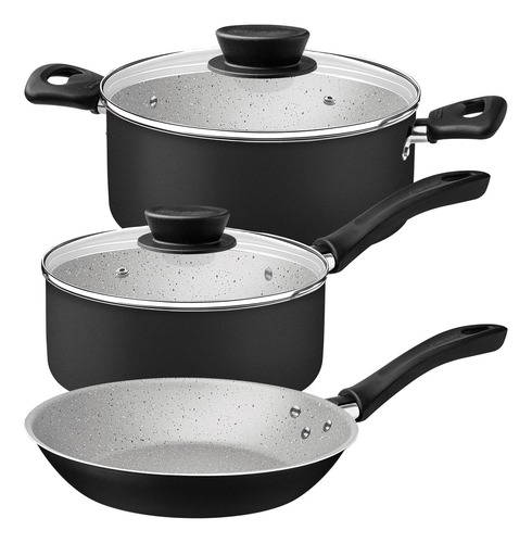 Juego de cocina Tramontina Linz de aluminio con revestimiento interno y externo antiadherente Starflon Max, negro, de 3 piezas. Compuesto por olla, cacerola y sartén, es un conjunto desarrollado en aluminio de espesor especial y revestimiento antiadherente Starflon. Por estas características, las piezas cocinan los alimentos de forma rápida y uniforme, sin que se peguen a su superficie; asegurando además mayor resistencia, durabilidad y facilidad de limpieza. Además no es perjudicial para la salud, ya que está libre de PFOA. Las ollas y sartenes vienen con tapas de vidrio templado con bordes de acero inoxidable y agarre superior de nailon, y todos los artículos cuentan con mangos o asas de Baquelita resistente al calor, un material que no se calienta y proporciona un manejo cómodo y seguro. Además de todas estas características, las piezas del juego se pueden meter en el lavavajillas y utilizar en cocinas de gas, eléctricas y de vitrocerámica - resistencia eléctrica.