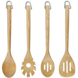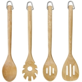 El set de utensilios de cocina Kitchen Aid eta compuesto por volteador sólido y ranurado, cuchara ranurada, espátula y ganchos para colgar todos en madera de Abedul.